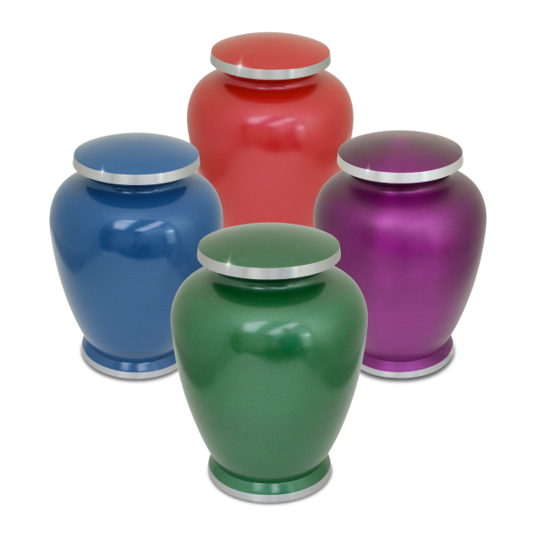 | Product Description : This set includes four vibrant aluminum urns in red, blue, green, and purple—crafted from quality materials with a sleek finish. A perfect way to expand your selection while offering real savings. Ideal for funeral homes looking to stock a variety of colors at a great value. Same Day Shipping Cutoff: |