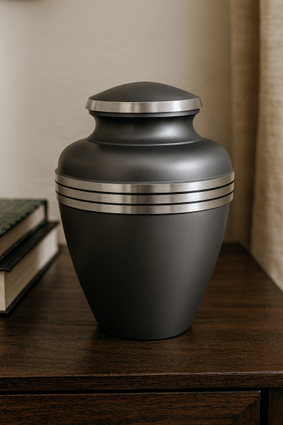 | Product Description : UPD has supplied funeral homes with reliable urns for over 20 years. Made from solid brass, with a black finish and clean silver bands. Keep this in stock for families looking for a simple, classic urn. Same Day Shipping Cutoff: |